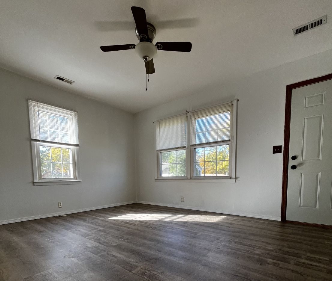 Step inside this updated 2-bedroom, 1-bath home offering 672 square feet of efficient, comfortable living space. New laminate flooring runs throughout most of the home, with one bedroom showcasing beautifully polished original hardwood floors. Both bedrooms include closets for added storage. The bathroom features a shower/tub combo, new ceramic tile flooring, and a stacked washer and dryer for convenience.