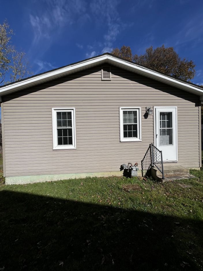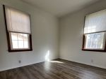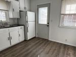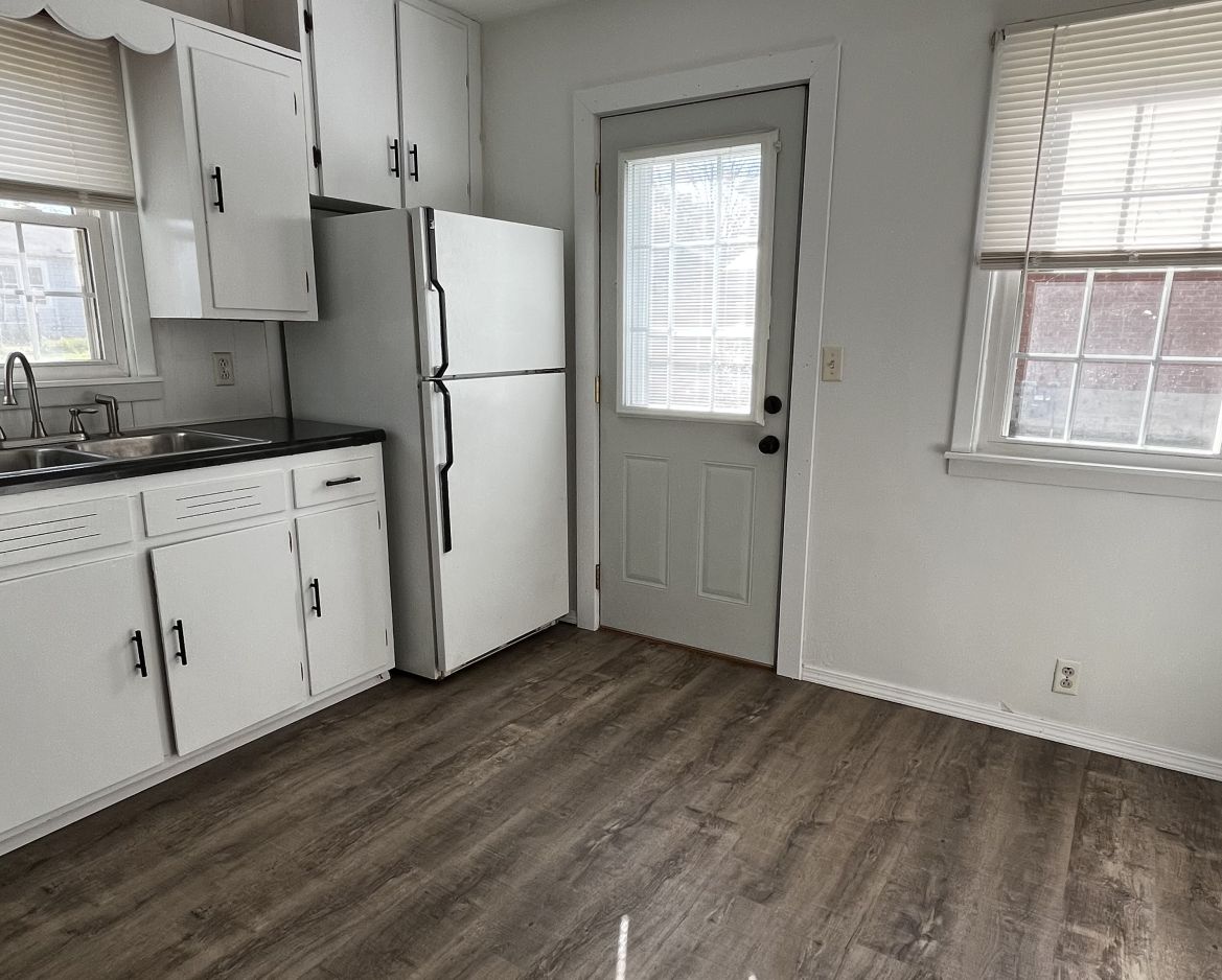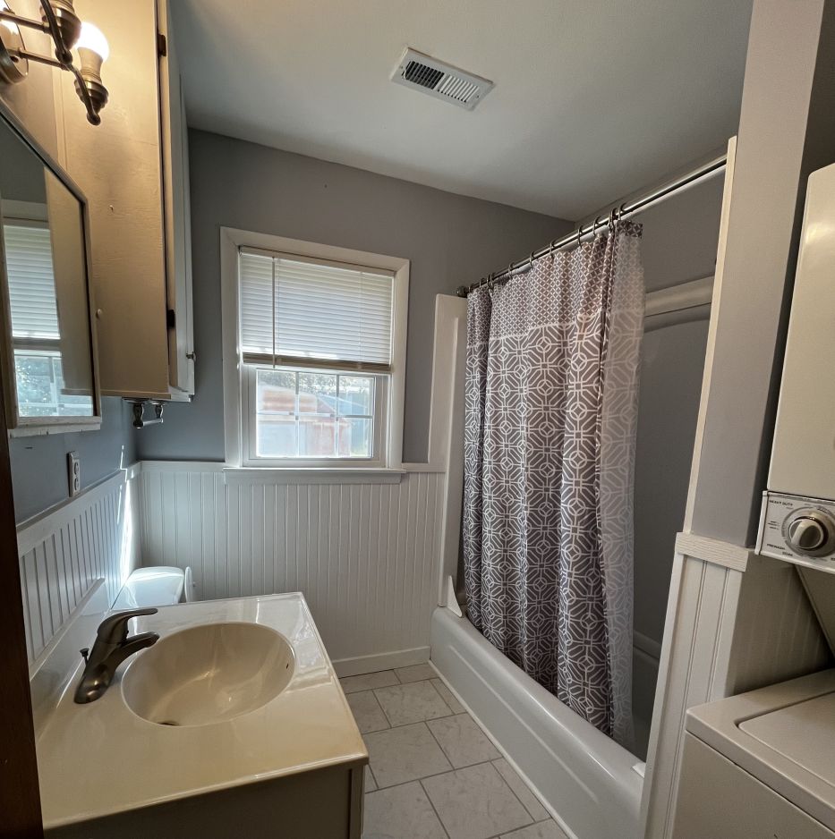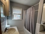 The kitchen comes equipped with a gas stove and refrigerator, and the original kitchen and bathroom cabinets have been freshly painted. New shades throughout the home add a clean, modern touch.